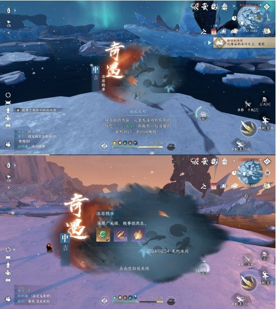 本篇带大家看一下逆水寒手游2.1.3版本新增奇遇的冻原轶事需要玩家前往无朽冰川(737,1049)拾取纸团触发奇遇,触发后对话安继进入任务场景,根据指引即可完成任务