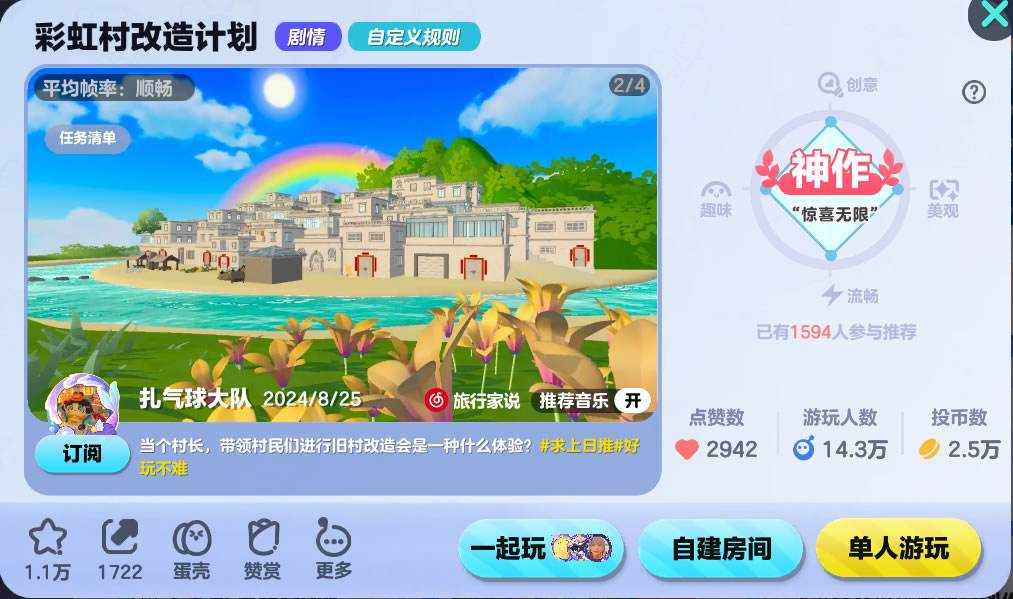 由扎气球大队制作的一张《蛋仔派对》手游地图,最近比较受玩家的喜欢与推荐,地图名称叫彩虹村改造计划,玩法规则是剧情,自定义规则。