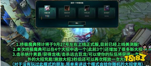 英雄联盟终极魔典即将回归,这次将会有4个大招可供选择,换大招给300金币和属性。击杀纳什男爵/获得龙魂/击杀远古巨龙/可以使你的队伍将获得一次额外的大招充能!