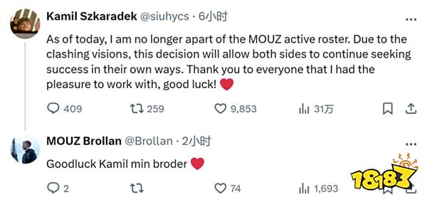 在社交平台上,siuhy也发布动态:“截至今日,我已不再是MOUZ战队的现役成员。由于愿景不合,这一决定能让双方以各自的方式继续追求成功。感谢所有与我共事过的人,祝你们好运!”
