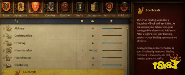 MOD建立了五级水蛭术技能体系,每一级都通过可见的增益效果进行追踪,并配有独特的中世纪医学背景描述文本,增强了游戏的历史沉浸感。技能进度会在睡眠后或加载存档时自动更新,无需手动操作,保持了游戏体验的流畅性。MOD还精心设计了游戏难度曲线,前期绷带消耗加快增加了生存挑战,后期则通过学识积累实现资源节约,形成了良好的游戏平衡。