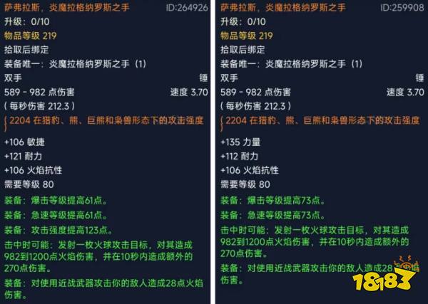 魔改后的橙锤【萨弗拉斯,炎魔拉格纳罗斯之手】装等高达219,属性也非常强力,同时还给玩家提供了力量版和敏捷版两个版本,每一个都是对应职业的毕业武器。这把武器对萨满还有额外的加成,因为萨满在80版本一般是双持增强,所以暴雪就给橙锤添加了一个额外技能。目前数据挖掘出来的【熔岩粉碎】,技能说明是“你用熔岩充能萨弗拉斯,拉格纳罗斯之手,立即造成101%的武器伤害。如果萨弗拉斯,拉格纳罗斯之手附魔了火舌,则伤害提高25%。”这很明显是为了让增强萨能玩双手增强而添加的全新技能,就看到时候表现如何了