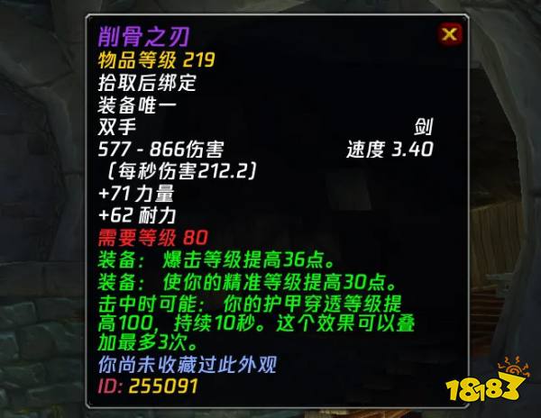 削骨之刃在60年代MC阶段就非常强力,目前到了时光服之后属性依旧霸道。这把双手剑虽然常驻属性比同装等武器低,但是它的特效却特别强。击中时可能提高100护甲穿透等级,最多可以叠加3层,相当于是提高了300护甲穿透等级。