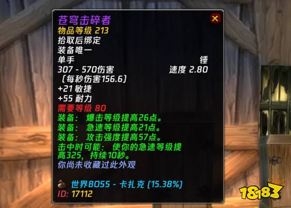 60年代赫赫有名的“日天锤”到时光服里复活了,而且属性依旧强到爆。213的苍穹击碎者常驻的敏捷和攻击强度比正常的武器略低一些,但是却获得了极强的属性:“击中时可能:使你的急速等级提高325,持续10秒。”