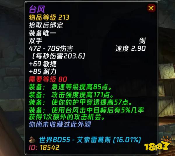 台风这把武器由世界Boss蓝龙艾索雷葛斯掉落,60级的时候加招架属性很差,但是到了时光服之后,暴雪移除了招架,反而增加了一个极其牛掰的属性:击中时有5%的几率再攻击一次。