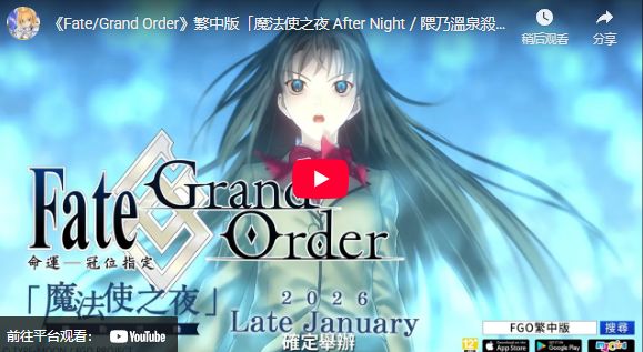 《Fate/Grand Order》繁中版于1月15日启动"魔法使之夜×FGO"联动前夕纪念活动,为预计1月下旬正式开启的联动预热。本次活动包含登录奖励、强化加成及多轮限定卡池,帮助御主提前备战。