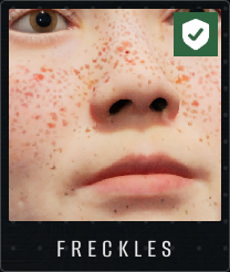 雀斑(绿色症状)表现为幸存者面部(包括脸颊和鼻子)出现大量通常为棕色或橙色的小点。