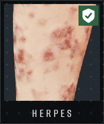 疱疹(绿色症状,必须在实验室中解锁)表现为由不规则形状的小斑点组成的皮疹,通常为棕色或红色,且没有丘疹。