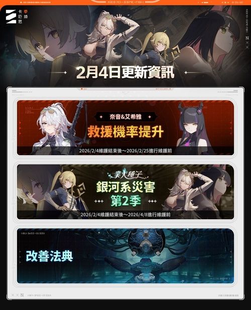 "银河系灾害"第2季将分三章逐步开放:2月4日开放第1章"竞技场的战士们"、2月25日开放第2章"沙漠王国遗迹"、3月18日开放第3章"心意、约定"。赛季持续至4月8日,赛季结束后相关存档资料将保留,并纳入游戏"法典"系统中永久保存。