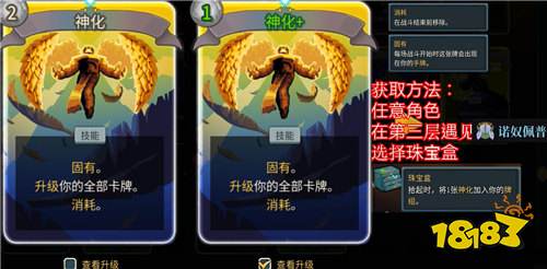 最后,击败诺奴佩普后,在奖励选项中选择"珠宝盒"(Jewelry Box)。珠宝盒的效果是"拾起时,将1张神化加入你的牌组"。这是目前游戏中神化卡牌的唯一稳定获取途径。
