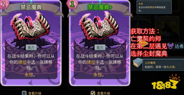 在获取方式方面,角色限定为该卡牌为亡灵契约师专属,其他角色无法直接获取。获取途径是在第二层遇见 Boss 达弗,这是关键的节点。选择奖励则是击败达弗后,在奖励选项中选择尘封魔典。尘封魔典效果为拾起时,获得一张先古牌。通过此方式可获得禁忌魔典卡牌,玩家需注意把握机会。