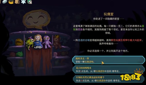 该事件通常在地图问号节点随机出现。当玩家进入这个堆满玩偶的密室后,系统会要求选择一个玩偶并离开。场景氛围神秘,每一个玩偶都代表着不同的潜在收益,玩家需在进入前做好心理准备。