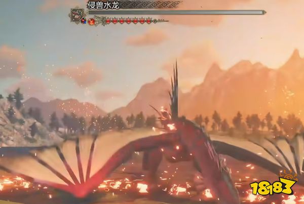 从当前位置出发,距离很近,这里是水龙。等到 NPC 提示之后,用火属性攻击破坏它的头部。满足条件后,怪物会直接归巢。这一步是抓捕成功的关键,切勿盲目攻击。