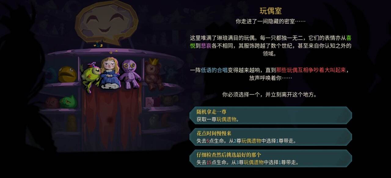 失去5点生命。从2尊玩偶遗物中选择1尊带走。
