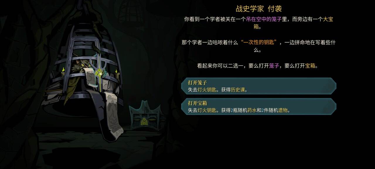 失去灯火钥匙。获得2瓶随机药水和2件随机遗物。