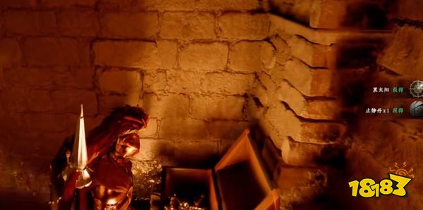 最后是破暗门进密室,先用坚守技能开启防御姿态,再用劲法攻击标记处墙面,暗门会被轰开。注意必须先坚守再劲法,顺序错误无法打开。进入暗门后的小密室,打开唯一宝箱即可直接获得黑太阳盾牌。