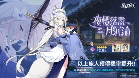 活动期间,旅人招募卡池「夜樱落尽月沉沦」于4月16日限时开启,全新限定5星旅人「乙叶」获得限时招募概率提升。乙叶是定位均衡的暗属性角色。作为一名行于暗夜的神秘忍者,她以伞骨为刃,袖里藏锋。在战斗中,她既能给暗属性队友提供可观的伤害加成,也擅长在援护位上发挥出色的范围伤害能力。
