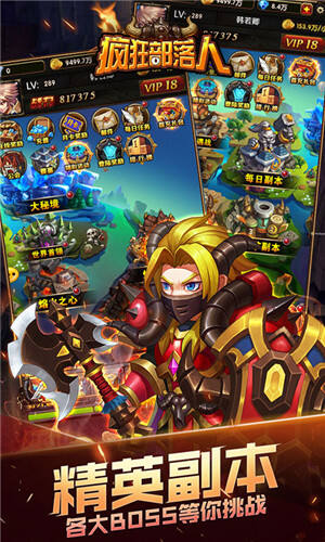游戏介绍:《疯狂部落人》是一款挂机动作手游。游戏中玩家同时操作战士、牧师、法师及助阵英雄,一共10个角色闯关冒险。游戏玩法丰富,包括了【个性时装】、【武器幻化】、【套装收集】、【武器附魔】、【技能装配】、【助阵英雄】、【10V10竞技场】等玩法,一键挂机自动战斗玩法,解放你的双手,享受更轻松随性的游戏乐趣。