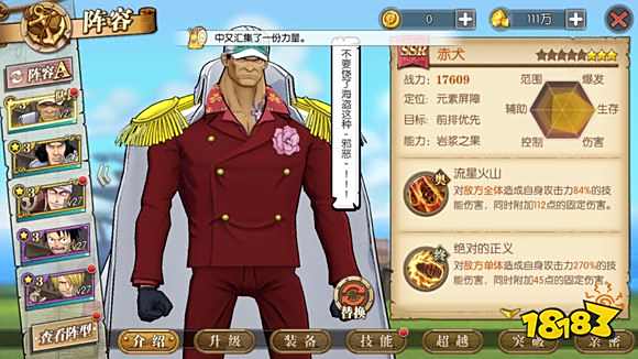 赤犬是游戏中输出型前排,拥有很高的伤害再加上不俗的防御,很多技能还带有百分比扣血,非常好用。