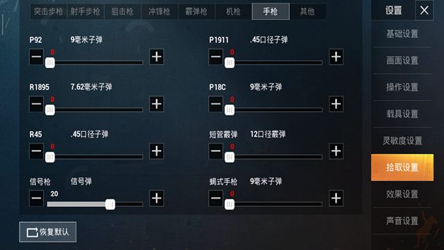 因为手枪武器在实战中发挥的效果一般,除了落地前期可以充当自卫武器之外,游戏中后期基本用不到手枪,所以小编建议:将手枪子弹的拾取上限调至0(仅留信号枪默认不变),弩箭的拾取上限也调至0,为的是在后续舔包过程中节省背包空间。