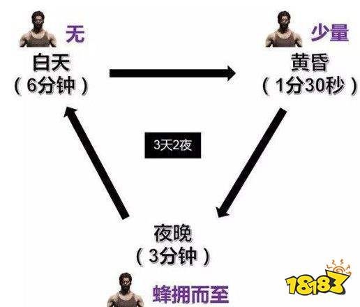 这个模式的主要玩法就是在丧尸横行的地图中生存三天两夜,这个模式并不难,掌握丧尸的刷新规律是关键,首先要知道丧尸们的大概数量及刷新时间。一般在白天是基本没有丧尸的,在六分钟的时间里可以放心的搜索物质和制定作战计划。黄昏的时候会有少量丧尸,但基本上不会构成什么大的威胁。而一旦到了夜晚,就将迎来与丧尸作战的白热化阶段,丧尸数量不仅多还会蜂拥而至的扑向玩家。不过只有三分钟的时间,只要白天的物资足够熬过这三分钟就行。