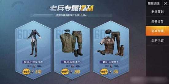 其中的第二项叫做“老兵专属福利”,瞬间引起了小编的关注。点进去之后发现,原来一共有3套衣服,分别是幻世保卫者、超能勇士、云霄猎人。