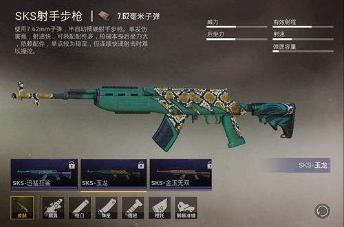 在和平精英军备库中,我们可以看到一款SKS的全新皮肤SKS玉龙,那么这款SKS玉龙该怎么获得呢?SKS玉龙多少钱?下面就随小编一起来看看吧。