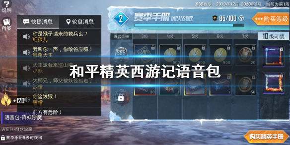 赛季手册等级到达5级时领取永久西游记语音,购买168的精英手册豪华包直升20级,可以直接领取语音包。