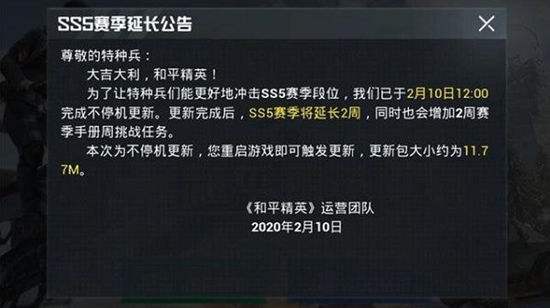 为了让特种兵们能更好地冲击SS5赛季段位,我们计划于2月10日10:00-12:00进行不停机更新。更新完成后,SS5赛季将延长2周,同时也会增加2周赛季手册周挑战任务。