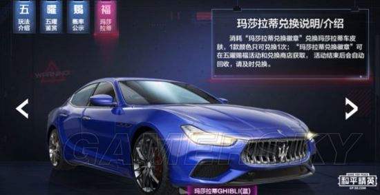 玛莎拉蒂载具皮肤的获得方式是需要特种兵去参加“五耀赐福”活动,活动的持续时间为2020年1月24日至2020年2月20日。在活动中,特种兵消耗一定的幸运币来随机获得星耀类型,并提升星耀等级。任意一种星耀类型,只要特种兵可以将其星耀等级提升到6级或7级,都可以获得玛莎拉蒂兑换徽章奖励。其中6级星耀等级可以领取一枚玛莎拉蒂兑换徽章,7级星耀等级可以领取三枚玛莎拉蒂兑换徽章;此外,特种兵还可以利用自己已经拥有的“五耀令牌”在活动的“兑换商城”里直接兑换莎拉蒂兑换徽章,需要消耗2916枚“五耀令牌”。