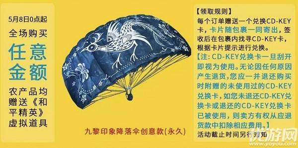 川北在线核心提示:原标题:和平精英九黎印象降落伞怎么得 九黎印象降落伞CD-KEY卡获取方法 和平精英九黎印象降落伞怎么得?九黎印象降落伞创意款(永久)并不是在游戏中购买或抽奖获取的,而是需要玩家在指定入口购买任意金额农产品后,通过赠送的CD-KEY卡进行兑换的。快一起看看吧。