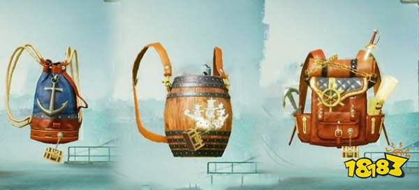 虽说时装很普通,但是这次的背包和枪皮,还是让人眼前一亮。先来看看背包,一级包是带有船锚标志的袋子,感觉还挺时尚的;二级包是一个酒桶,这类桶也很有海岛特色;三级包风格比较独特,上面有船锚、船舵、船长宝剑等元素,看起来要更高级。