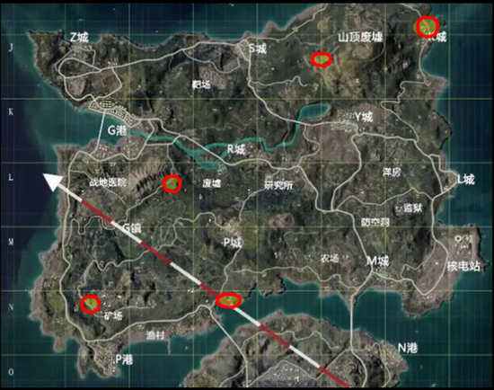 矿场、废墟边的打野点、山顶废墟和S城之间的野区、K城靠边的房区、以及P城最下方。