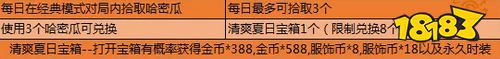 活动期间,每日在经典模式对局内,最多可拾取3个哈密瓜,用于兑换清爽夏日宝箱。