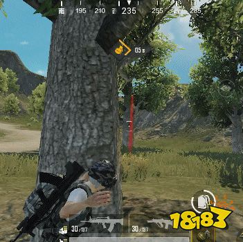 在山地地形里,对手常常会躲在树或者石头后面不出来,卡我们的位置。