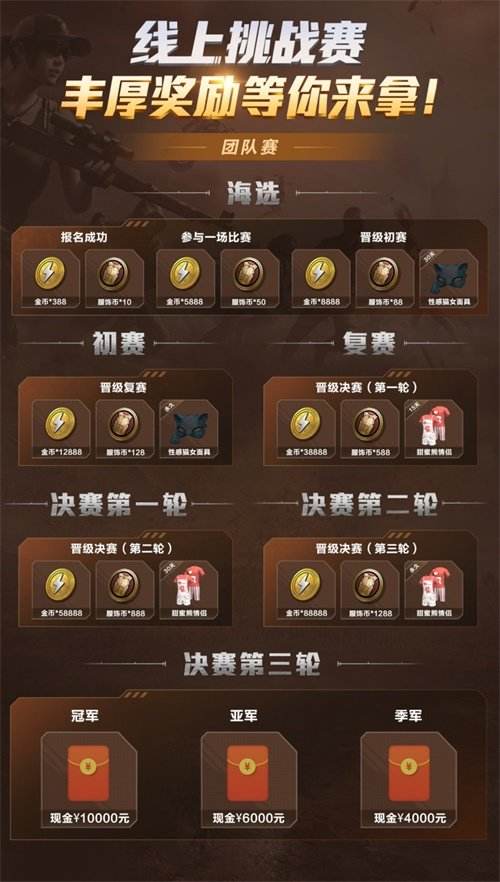 和平精英线上挑战赛的奖励非常丰富,4万元现金奖金池、精美服饰、数亿服饰币、百亿金币等豪礼统统等着你。除了丰厚的奖励之外,本次线上挑战赛积分前5的队伍还将获得直通和平精英城市赛全国总决赛的机会,如果在城市赛全国总决赛中表现优秀,还有可能前往职业战队试训,踏上电竞梦想之路。