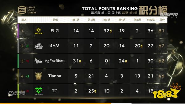 积分榜上ELG战队前几场都是稳字当头,第一场、第二场和第四场都是稳重求分,第三场也是成功拿下32的高分,但是第五场刚开始就被Tianba战队灭队,巨大的危机感,虽说总分已经很高了,但电竞场上的变故不可预料。