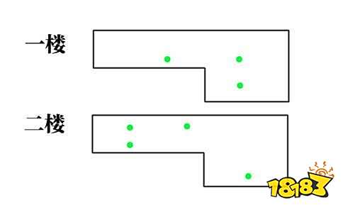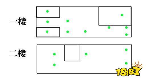 从图上我们可以看到,双拼房的一层二层一般都会各自有九个物资刷新点,总共高达18个刷新点。并且在实际游戏中一些刷新点经常会直接刷新两件甚至四件物品,这就让双拼房这个面积很小的建筑物的物资获取效率变得很高。