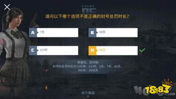40407小编总结正确答案就是d,90天,游戏中的封号处罚时间里面没有90天这个选项,所以我们选择90天就是正确答案,相信玩家都知道正确答案是什么了。那就快到游戏中领取属于你的奖励吧。