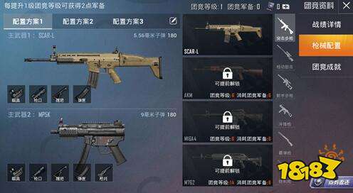 3、这样我们就能配置我们自己的武器了,可以自由搭配两把主武器,解锁新的枪械就需要团竞等级达到一定的要求,并消耗对应数量的团竞军备。