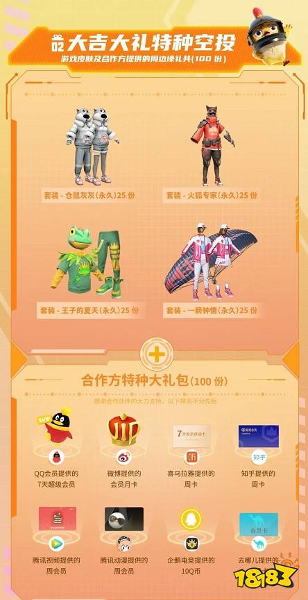 12月25日-1月1日活动期间,前往和平精英官方微博参与#和平精英大吉大礼狂欢季# 活动,许下自己的新年愿望,即有机会获得代言人签名物资、2千多套稀有皮肤,以及18家俱乐部、9家合作方提供的周边壕礼。