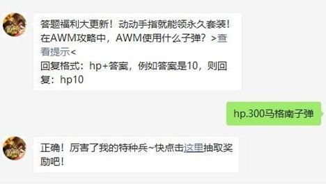 答题福利大更新!动动手指就能领永久套装!在AWM攻略中,AWM使用什么子弹?>查看提示<