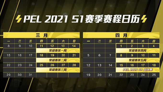 PEL和平精英职业联赛 2021 S1赛季赛程共六周,常规赛五周,总决赛一周。