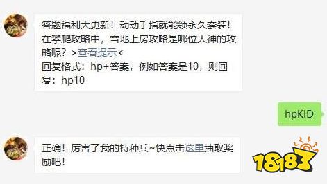 答题福利大更新!动动手指就能领永久套装!在攀爬攻略中,雪地上房攻略是哪位大神的攻略呢?>查看提示<