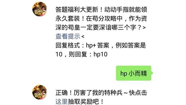 答题福利大更新!动动手指就能领永久套装!在苟分攻略中,作为资深得苟皇一定要深谙哪三个字?>查看提示<