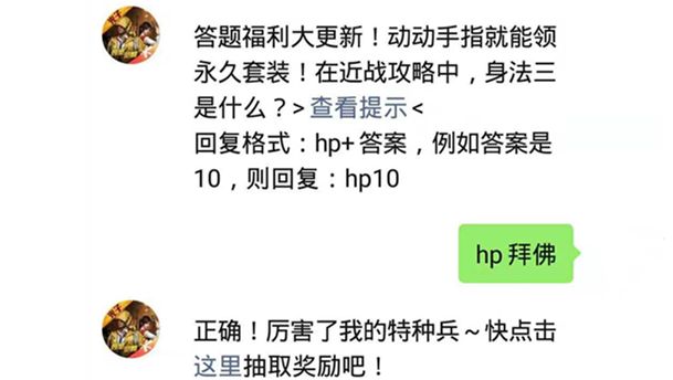 答题福利大更新!动动手指就能领永久套装!在近战攻略中,身法三是什么?>查看提示<