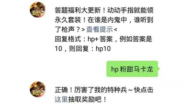 答题福利大更新!动动手指就能领永久套装!在谁是内鬼中,谁听到了枪声?>查看提示<
