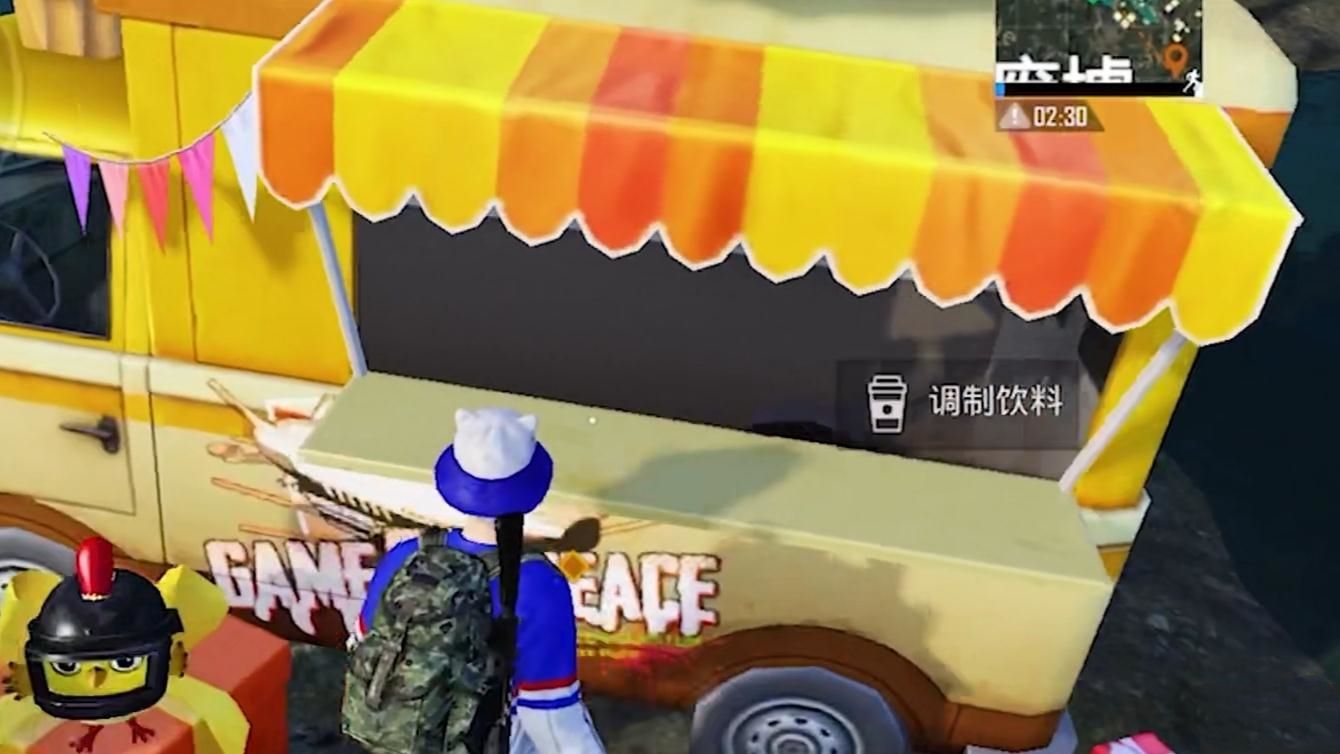 玩家在降落到小鸡图标位置后,可以找到一辆金黄色的饮料车,车前放着很多礼物盒,礼物盒子的上面还有一只带着三级头盔的小鸡。