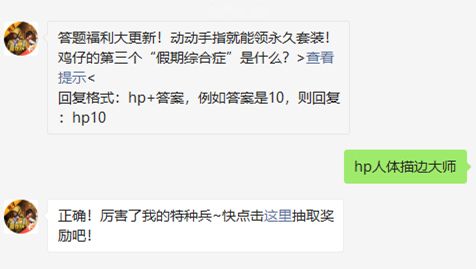 答题福利大更新!动动手指就能领永久套装!鸡仔的第三个“假期综合症”是什么?>查看提示<