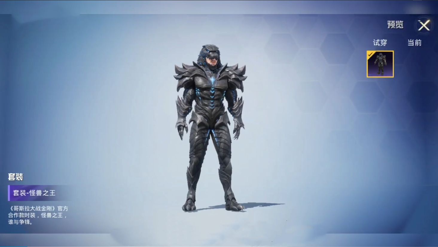 在和平精英国际服中就已经上线了同名怪兽之王套装,但是同名不重样,和平精英国际服满满的机甲元素。而国服怪兽之王的服饰更加贴合电影哥斯拉形象的外型。